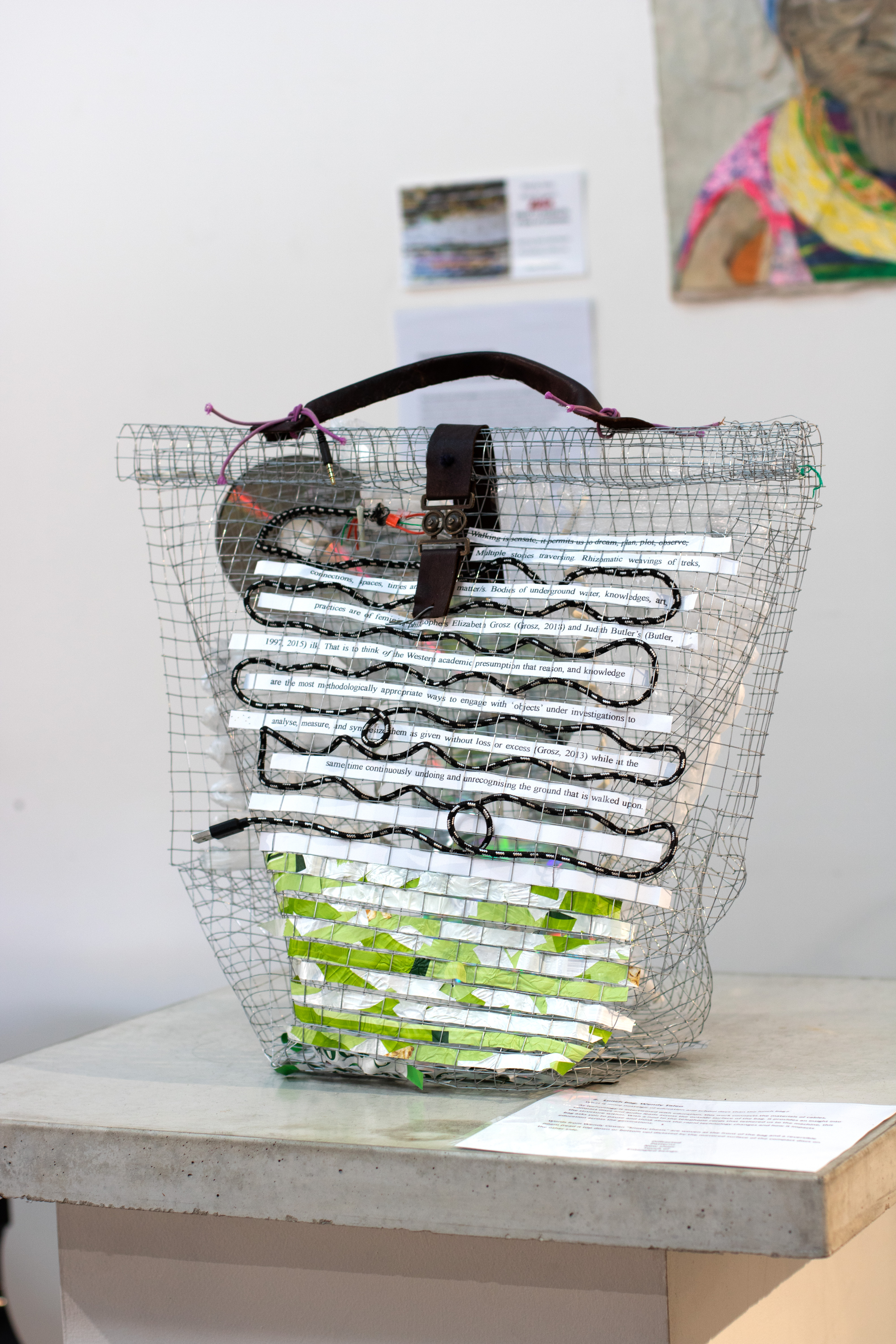 As technology is intertwined with education, this work connects the materials of cables, compact discs and audio leads across the outside surface of the bag. It provides an insight into the structure within. With a nod to the telephone cords that tethered us to the machine, this bag asks you to pause and think about the rapid technology changes and how it impacts education across the generations.